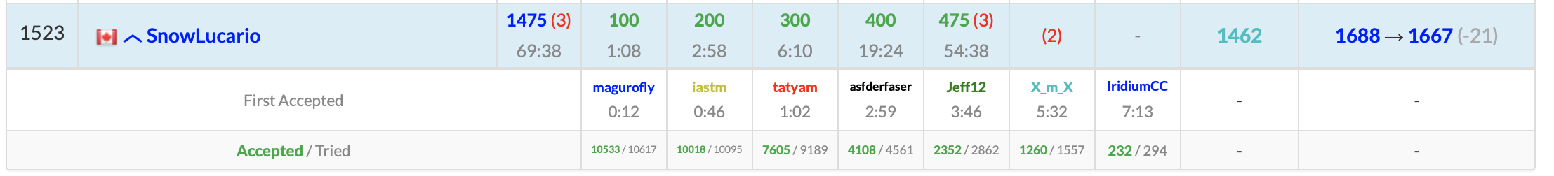 Unbeliveably, I’m also projected to drop in Leetcode rating in spite of solving all four problems in an hour. 2400+ ELO on Leetcode is pain.
