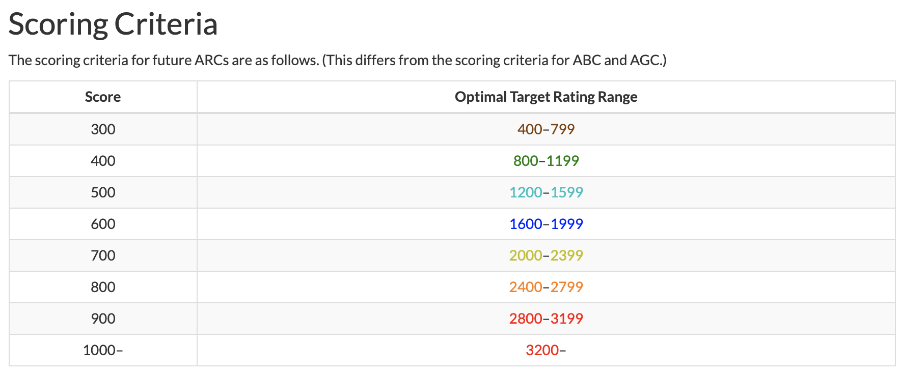 - Interestingly since the last time I was on AtCoder last September, an announcement about AtCoder Regular Contests was made which has a very interesting table for intended problem difficulties: