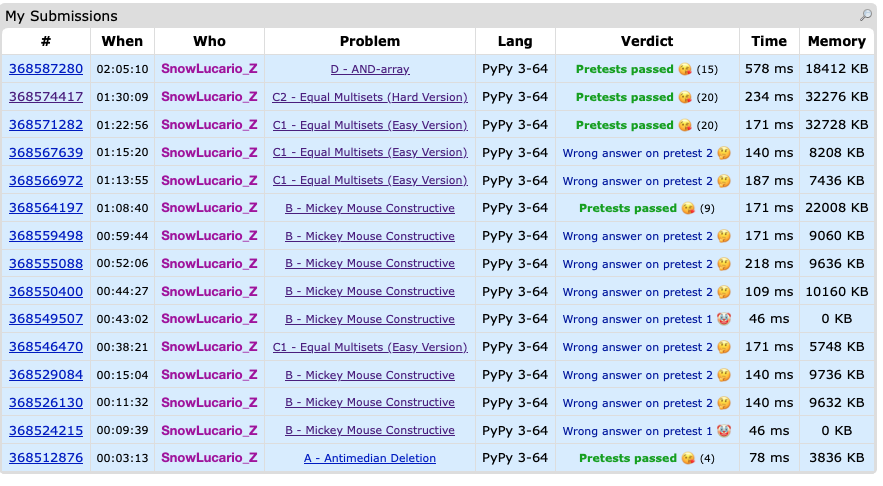 I was considering making this a seperate post but I only solved A, B, and C1, and spending more time discussing how I went up short on C2 and D for 100 minutes would make me more sad than I already am. It’s here that it feels clear to me that doing an AtCoder, then a CF round, then a Leetcode, then another CF round in the span of under 30 hours might have been a bit ambitious mentally.
