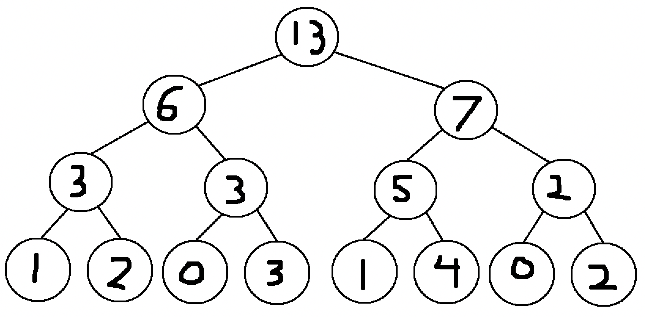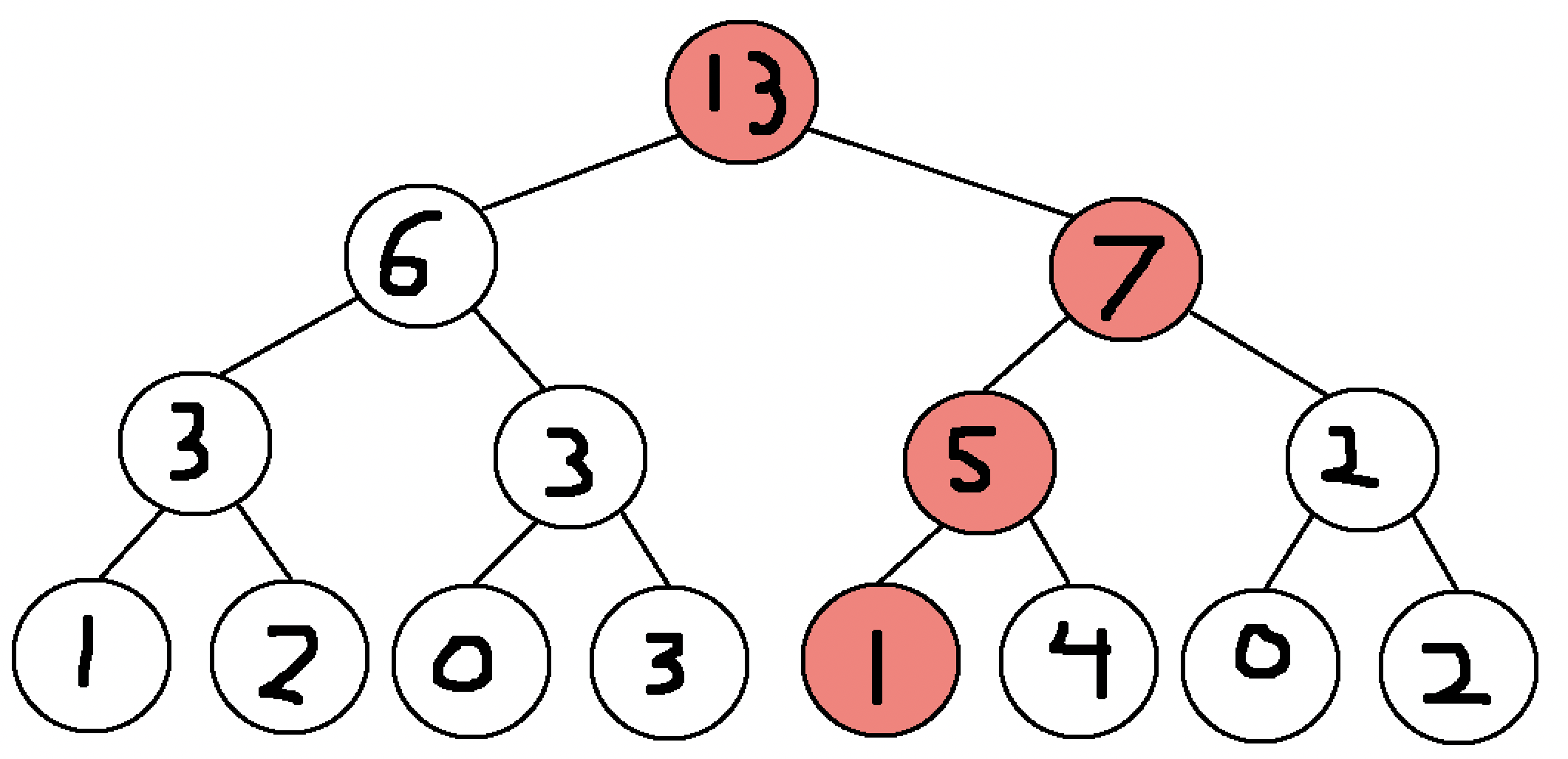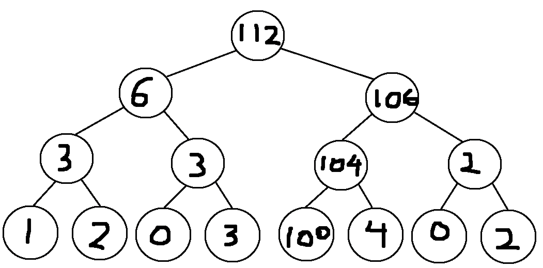 Now with this updated segment tree, the subarray sum queries can be computed in the same way as before. Even with a much larger tree, the number of nodes that need to be updated will always be equal to the number of layers in the tree, thus meaning that the amount of time needed to perform such an update scales logarithmically with the array size. This means that this is roughly as fast as the \(O(\log n)\) operation used for finding a subarray sum.