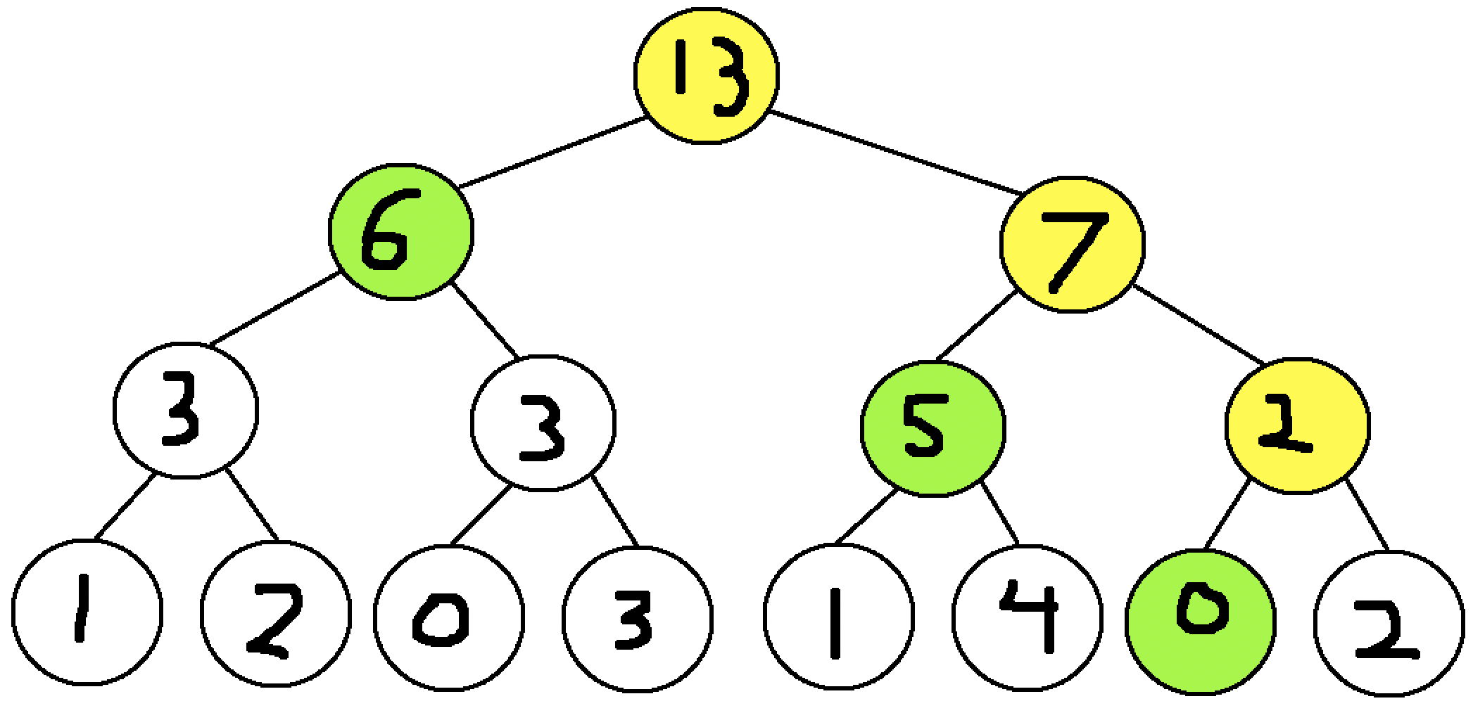 The yellow nodes indicate nodes that are only partially included in the subarray range. These nodes are not included in the sum but are instead searched deeper to their child nodes. The green nodes indicate nodes that are fully covered by the subarray range, so for maximum efficiency, these nodes are added to the sum and no further searching is required. For this example, the sum of the subarray from index 1 to 7 is \(6 + 5 + 0 = 11\).