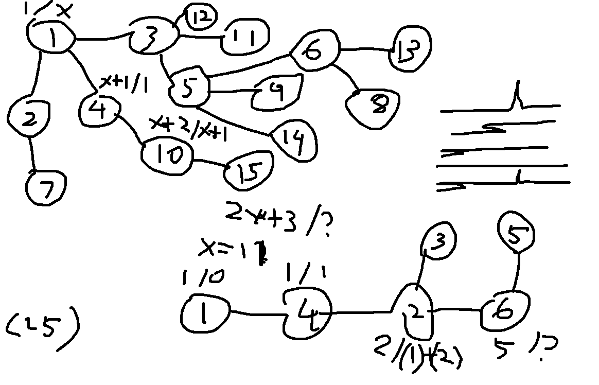 - \(B_i\) is dependent on the number of branching nodes that can be obtained by ignoring other nodes that would be in the path. This was observed in the testcase above, where \(x = 11\) and it just happens that if you ignore node 4, there are 11 other branching nodes from node 1.