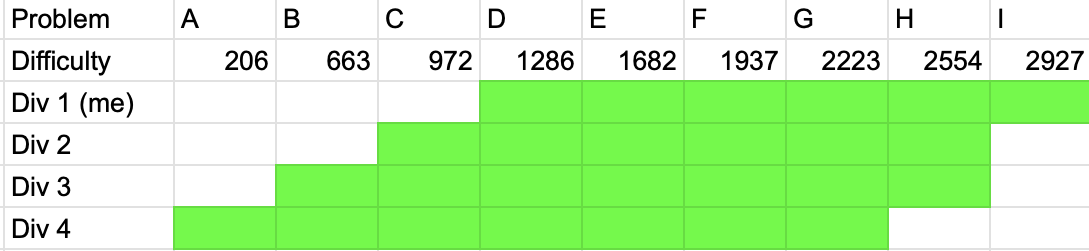 Asides from the gap between Div 1 and 2 being pretty small, this contest structure could be an interesting experiment, and in fairness, if CodeChef can have a 4 division structure with fewer coders especially in the upper divisions, CodeForces could definitely try this. It would at least be a better implementation of Division 4 than the separate Div 4 contests that have been held on CodeForces, but this is separate post entirely.