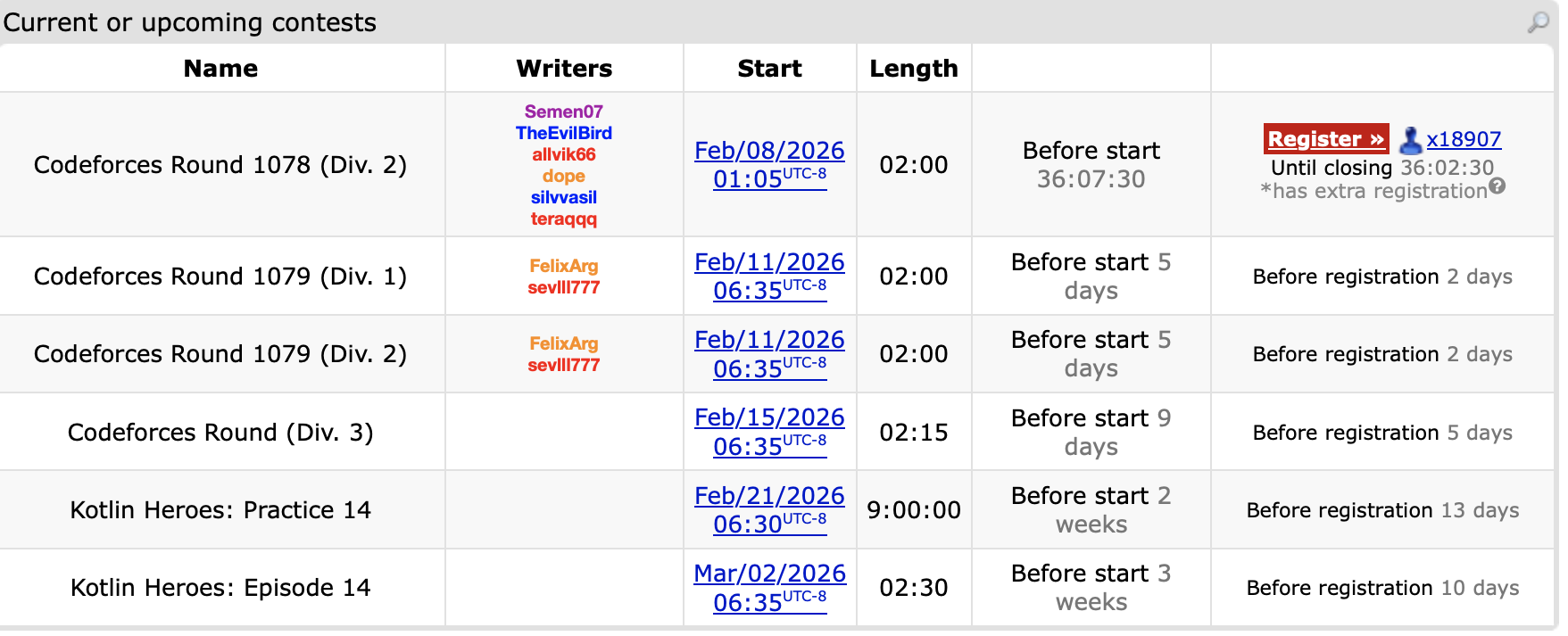 Each of these CodeChef Starters contests take place on Wednesdays 6:30-8:30AM PST. Usually I have class at either 8AM or 9:30AM on Wednesdays; even in the 9:30AM case, it is unlikely I’d be doing CodeChef as it takes ~80-90 minutes to get to class when leaving at 8:30AM, and I unfortunately do not have the mental will to wake up at 5AM to arrive early on campus when I’m pretty sure most buildings aren’t even open. Even still, there are going to be exceptions to this, and I plan on competiting on the Starters contest on February 18th next. Even if I feel AtCoder and CodeForces tend to have better problem quality (another post to be written at some point as to why), the problems on CodeChef are useful here, most of the issue is just a lack of competitions at the absolute top level.