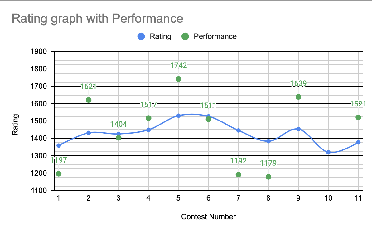 As for something less heavy, I have created a Google Sheets page here to document my performance on every CodeForces contest I have participated in so far as well as record additional statistics reflecting my performance. As an example, here is a chart showing all 11 rated contests I took part in so far with my rating graphed, as well as a scatterplot of my ELO performance on each contest.