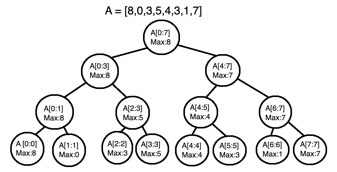This resulted in myself creating something known as a segment tree. Below is a visual example explained in this paragraph. The maximum value of a subarray with a single element is trivial, so n nodes can be created for an array A of n elements with each node holding the information that A[i:i], 0 <= i < n, has a maximum of A[i]. From there, parent nodes can be created for adjacent subarrays. The value stored for the ranges these parents nodes cover is the larger of the two maximums from its children. The process continues until a final parent node covering the entire array is created. This results in a binary tree containing various subarray ranges alongside their maximum values. To find the maximum value in any subarray, the tree can be traversed using a binary search-like method to obtain subarray segments that make up the full subarray.