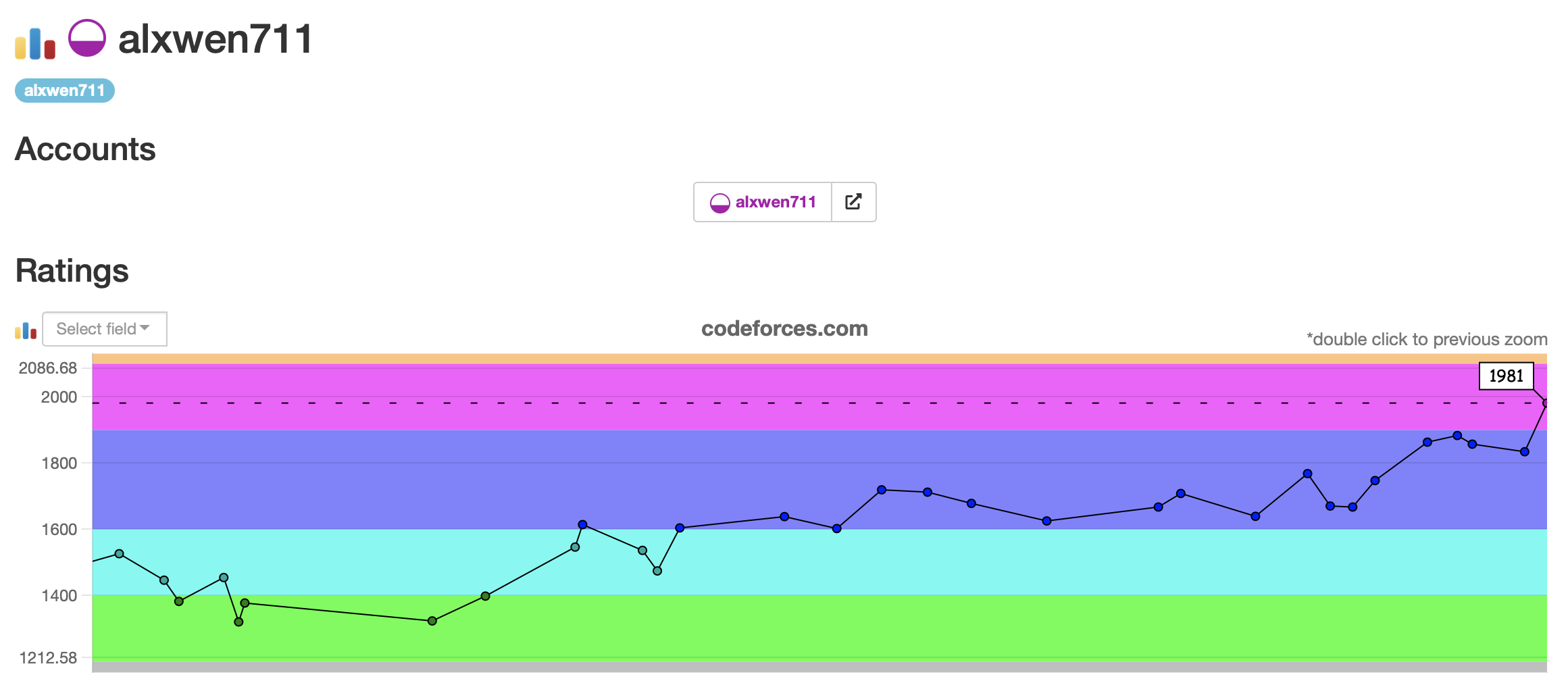 Then there is Problem D. In the contest I spent most of the remaining time trying to work out some sort of dp idea by writing out various patterns to no avail. With k = 1 I ended up with the sequence 1 1 2 2 3 4 5 6 7 10 12 15 and I still have no clue what the generating method is. Interestingly both C and D were 2000-rated problems. Even though both were around the same “difficulty”, I had widely varying success on them, which shows that I can solve Candidate Master level problems, just inconsistently. This contest also puts me in legitimate striking range of reaching 1900 ELO in the next contest, as my calculations find that I only require a similar performance of 1945 ELO to reach the goal.