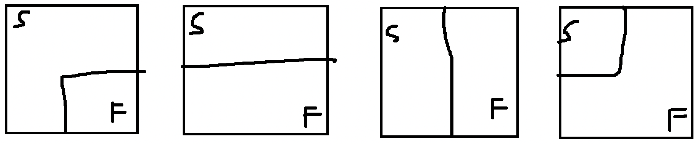 I’m not even mad over Problem D though. Had I avoided the 2 incorrect submissions I submitted for problems B and C each, I would have placed 1323rd with a penalty of 67, a performance of about 1690 ELO, and only losing about 70 ELO, keeping me in Candidate Master. Instead I proceed to be an absolute clown and completely forget about obvious test cases which unsurprisingly, results in additional penalties. Problem B was a glorified yes/no question where you needed to track which “walls” the laser touched to determine if a path existed. For my first submission, I said that a path did not exist only if the right and bottom walls were touched. In the below diagram, I initially thought only the left most scenario could lead to no paths.