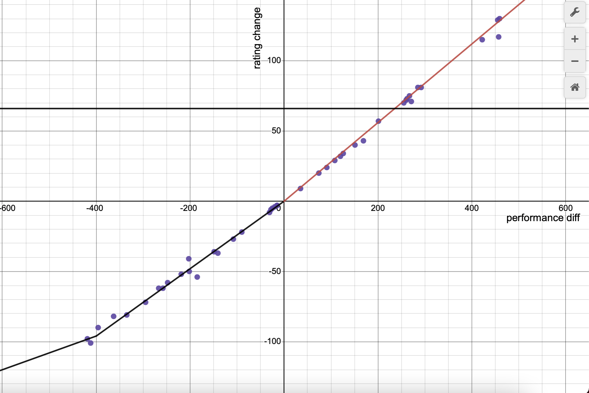 Each purple dot represents one ranked contest I have participated in on CodeForces. Based on these results I created a linear piecewise approximation to estimate performance based on rating change. This method is usually within 20 points of the method I’ve been using before so I’ll be switching, but past calculations are archived on the stat sheet.