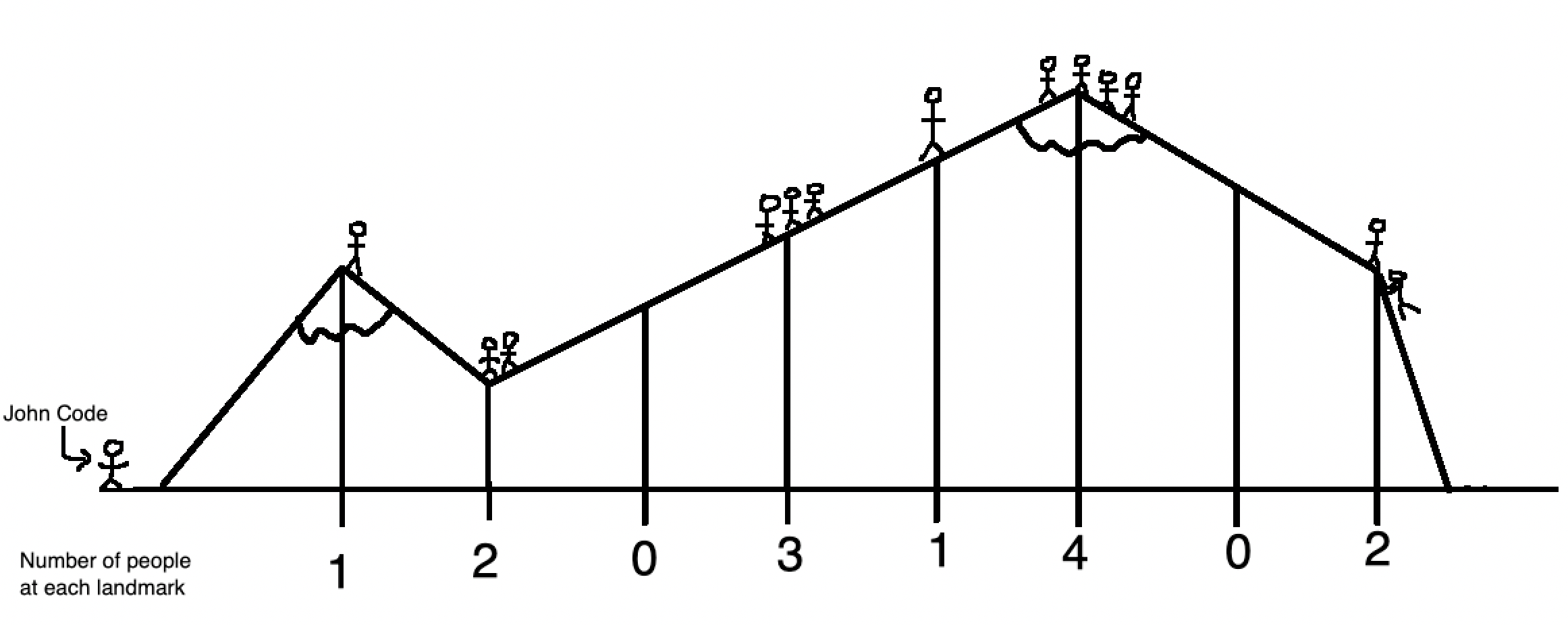 To demonstrate the effectiveness of the segment tree, let’s use it in an example, that acts as a continuation from last week’s post about sparse tables. After John Code (our hiker from last week) maps out a mountain range and all of the various peaks, he ends up with a new set of data indicating the number of people that visited each landmark over the past week: